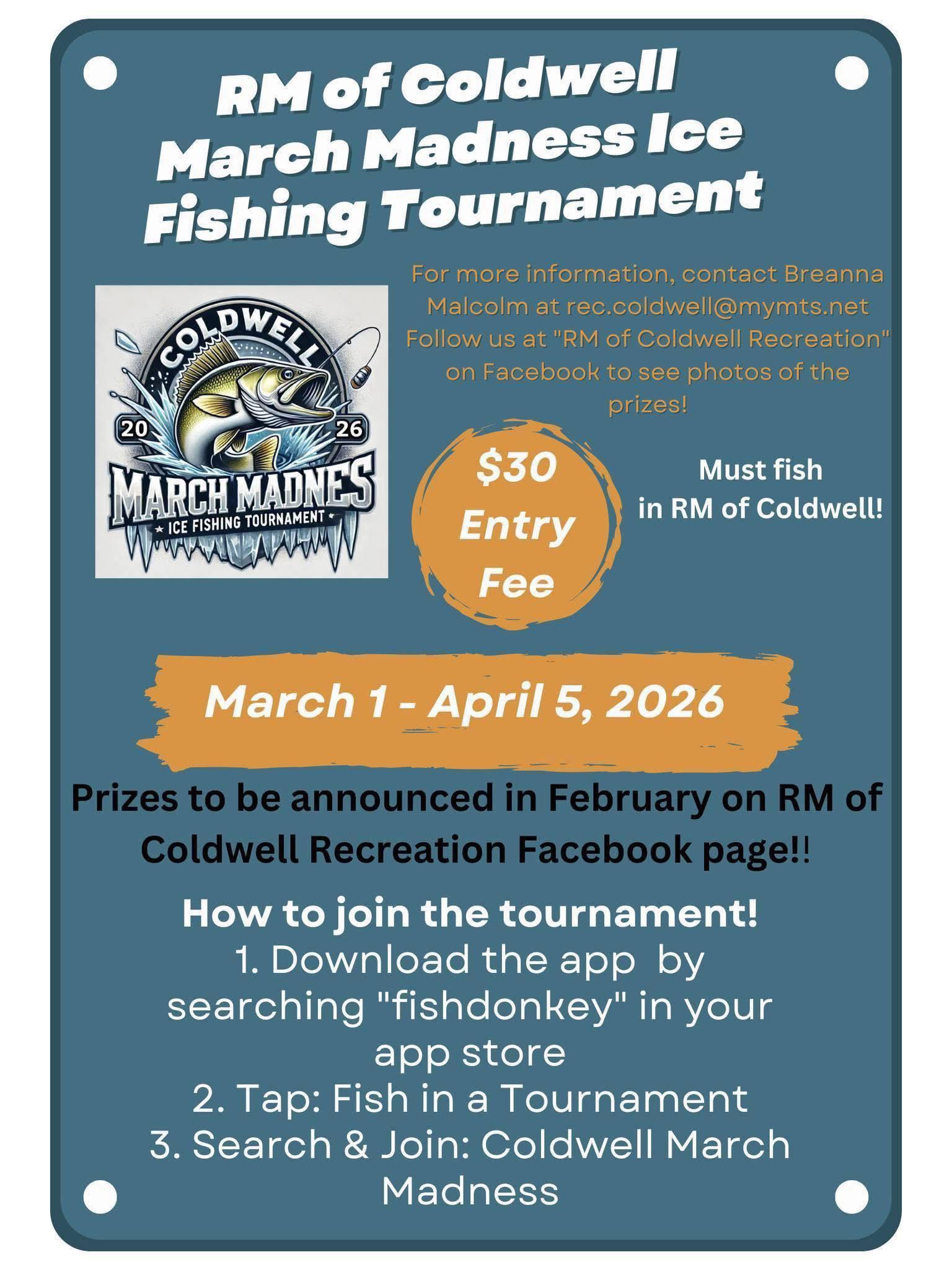 Naghahanap ng masayang gagawin ngayong Marso? Ang RM ng Coldwell ay nagsasagawa ng March Madness Ice Fishing Derby sa pamamagitan ng Fish Donkey app , bukas buong buwan at tatagal hanggang sa katapusan ng walleye season sa Abril 5. Mag-sign up, pagkatapos ay mangisda sa mga baybayin ng Lake Manitoba sa loob ng RM ng mga hangganan ng Coldwell. Good luck.
